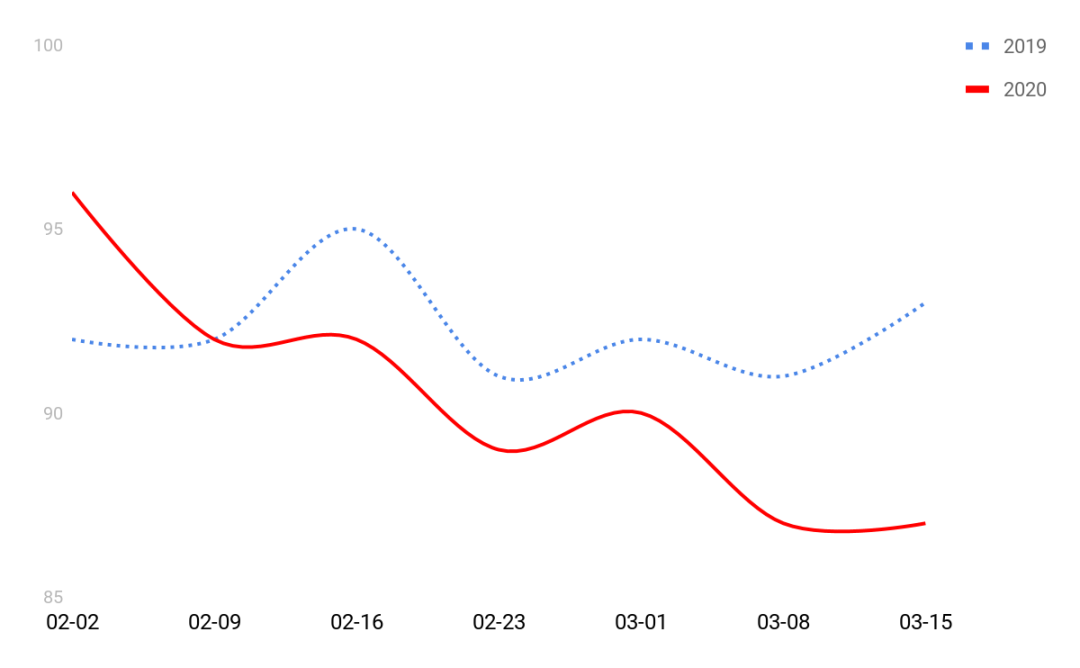 随着疫情在海外的蔓延,海外消费者的需求不可避免的被影响。从 Google Trends 我们可以看到,2 月 9 日以来,全球对于电商(e-commerce)的搜索需求已经低于 2019 年,并持续的走低。